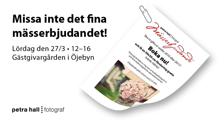Jag vill bjuda in mina bloggläsare till en mysig mässa på Piteå Stadshotell, tisdagen den 27 april, mellan klockan 19 och 21. Det blir en mysig sammankomst med flera utställare som rör bröllop och andra högtider. Utställare från alla branscher som kläder, mat, juridik, blommor, resor, fotograf, hudvård, makeup, florist, hårsalong, presentartiklar, smycken, osv. Läs […]